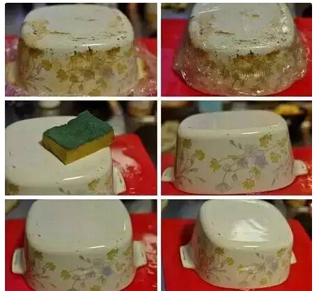 5、**天,將保鮮膜撕下來,直接用百潔布擦洗,這時候所有的污垢都自動脫落了,整個鍋煥然一新,非常干凈。